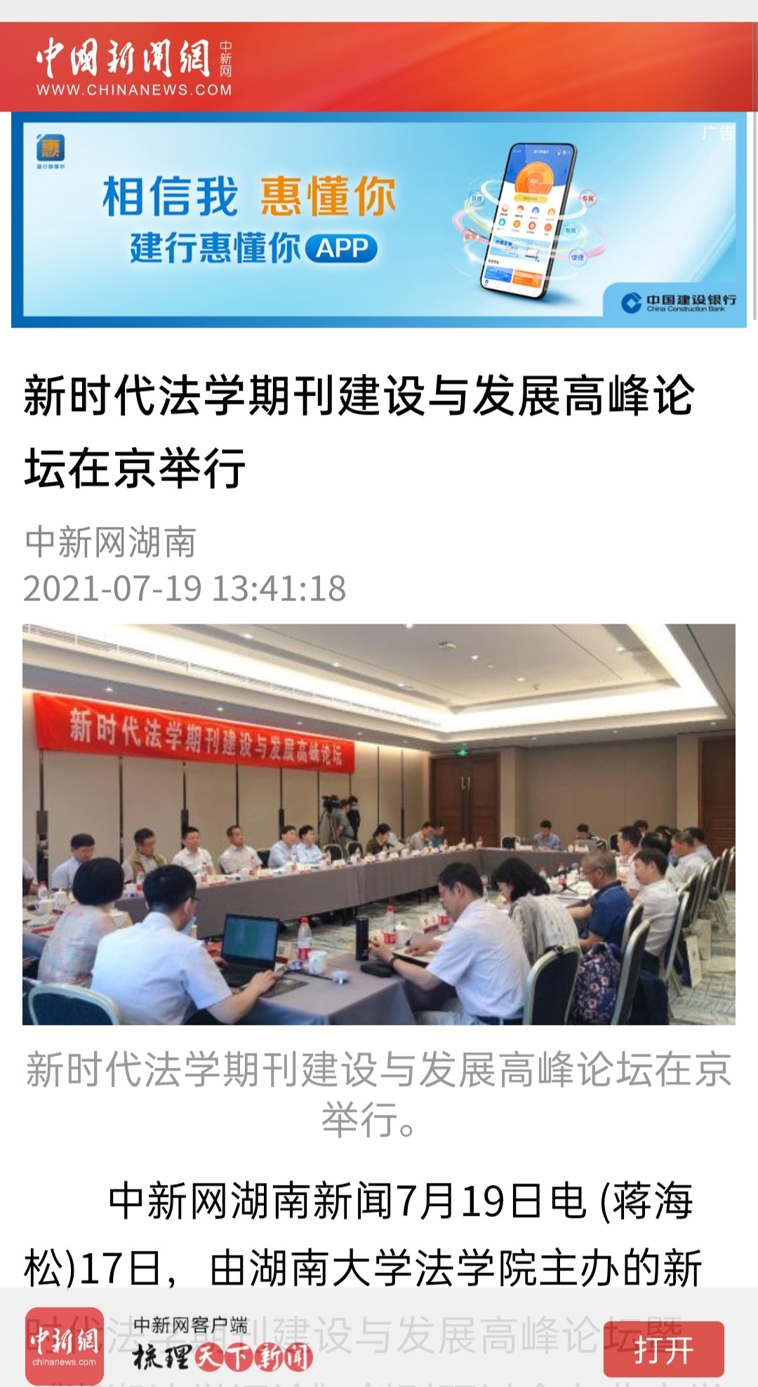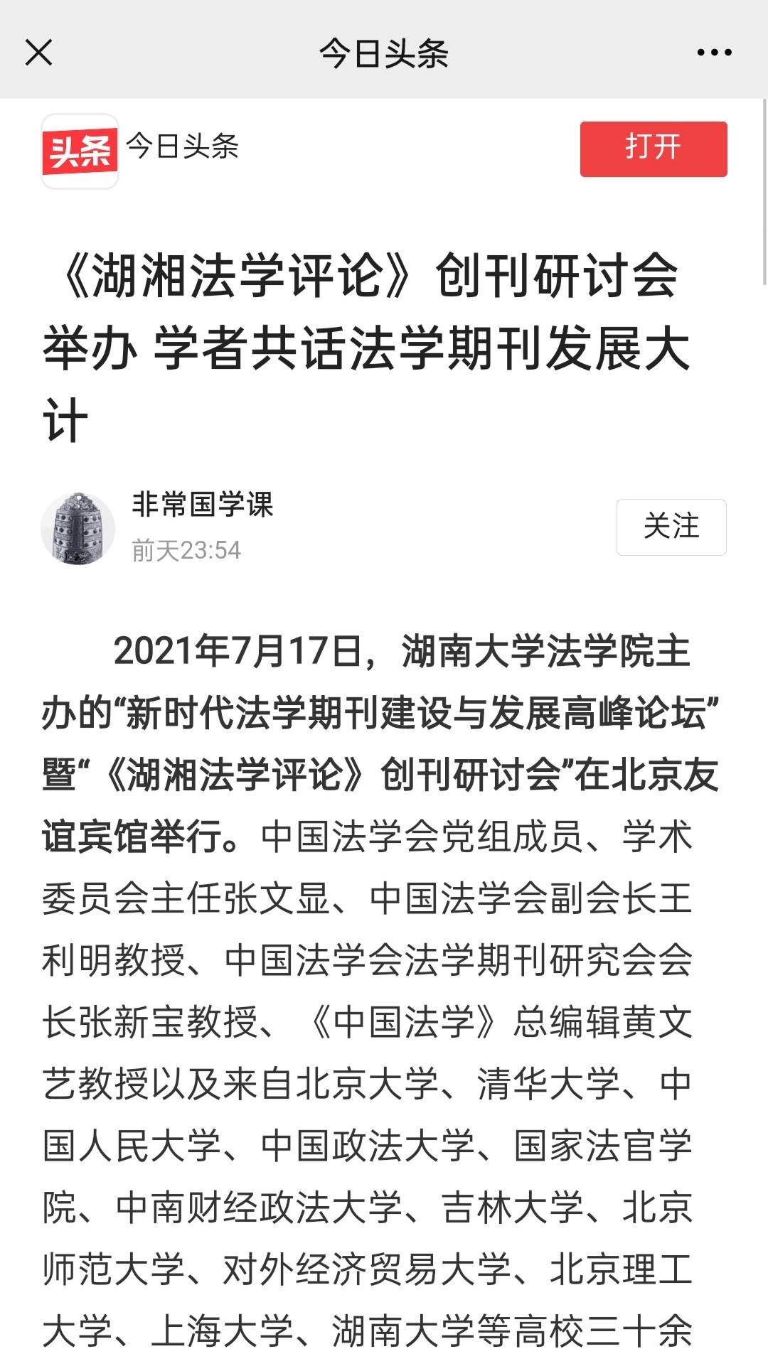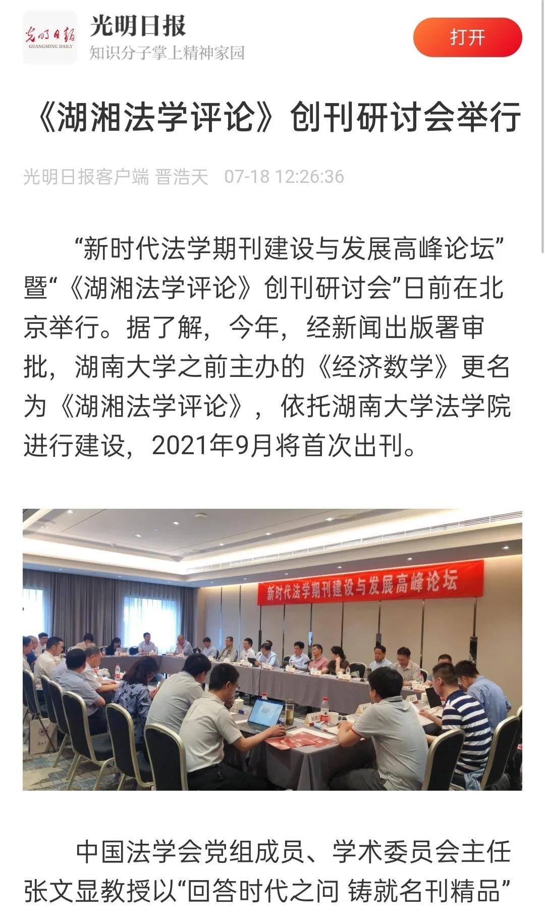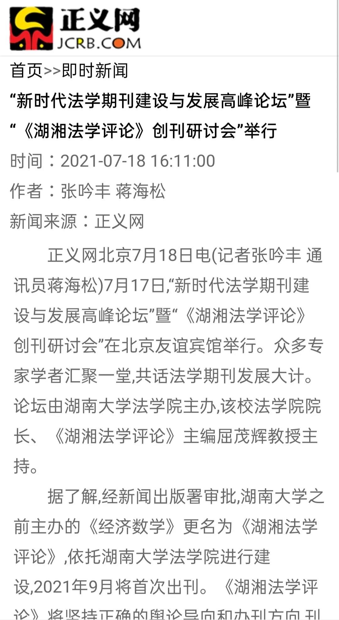 主办的“新时代法学期刊建设与发展高峰论坛”暨“《湖湘法学评论》创刊研讨会”在北京友谊宾馆举行。《湖湘法学评论》的成功创刊及研讨会的成功举办引发媒体密集报道。目前,已有《光明日报》、人民网-人民资讯、中国新闻网、法治日报—法制网、检察日报-正义网、《法治周末报》、凤凰网、《法制周报》、新湖南客户端、《三湘都市报》、红网、《长沙晚报》、腾讯网、华声在线等为此推出报道,《中国法学》杂志社公众号、教授加、法学学术前沿、法科生之家、法研在线等知名法律界公号推出了详细报道。