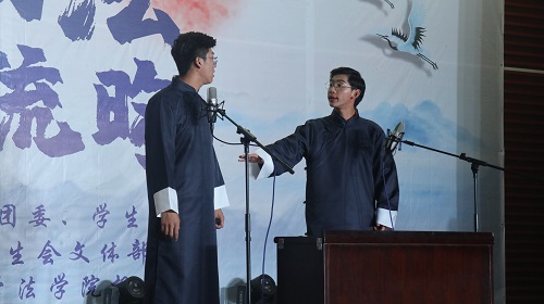 舞台剧《大学老师茶话会》展现出大学辅导员在同学们学习、生活、人际交往等方面的无私奉献,法学1901班同学用生动活泼的表演形式表达对辅导员老师的理解与尊敬,号召同学们在大学期间努力学习、积极进取。赵行、刘睿涵同学带来的乐器合奏《天空之城》让观众徜徉在美妙的音乐世界,感受跳动的音符带来的愉悦与静谧,收获了现场观众持久不息的热烈掌声。法学1903班同学献上歌曲《年少有你》,致敬洋溢激情与甜蜜的青春韶华。法学1904班同学带来的舞台剧《对龙谈法》体现对环境保护与经济发展之间关系的思考,并且融入环境保护法等法学知识,表现91论坛