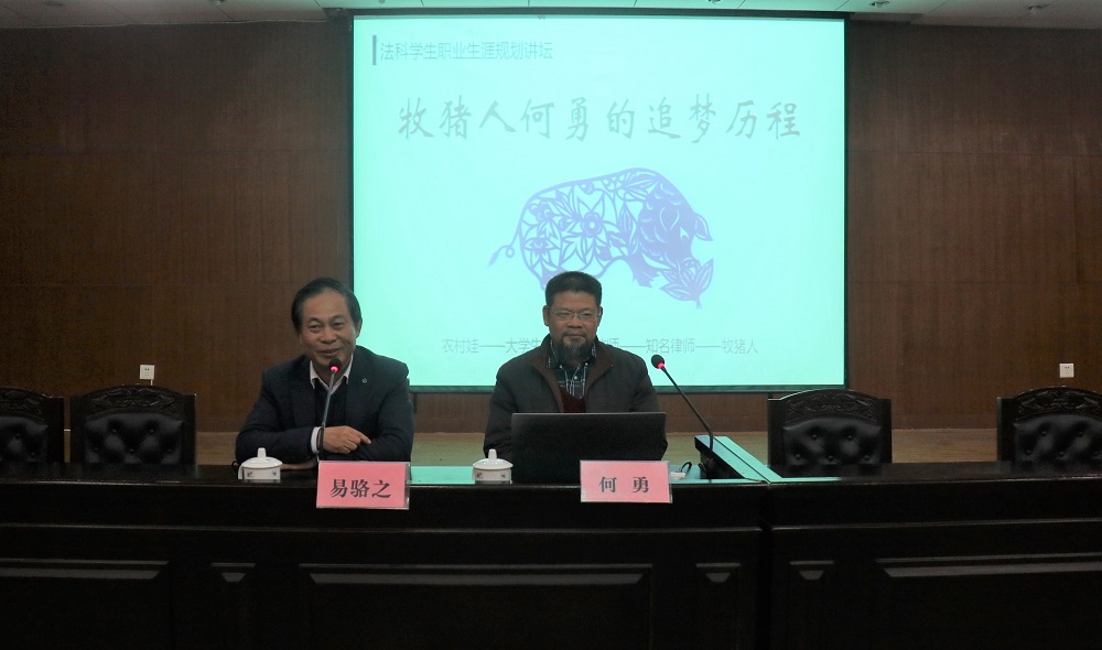 在讲座中,何勇主要向同学们分享了自己从一名律师转变为“牧猪人”的经历,由此鼓励同学们勇敢追梦,争做未来时代的新型青年。