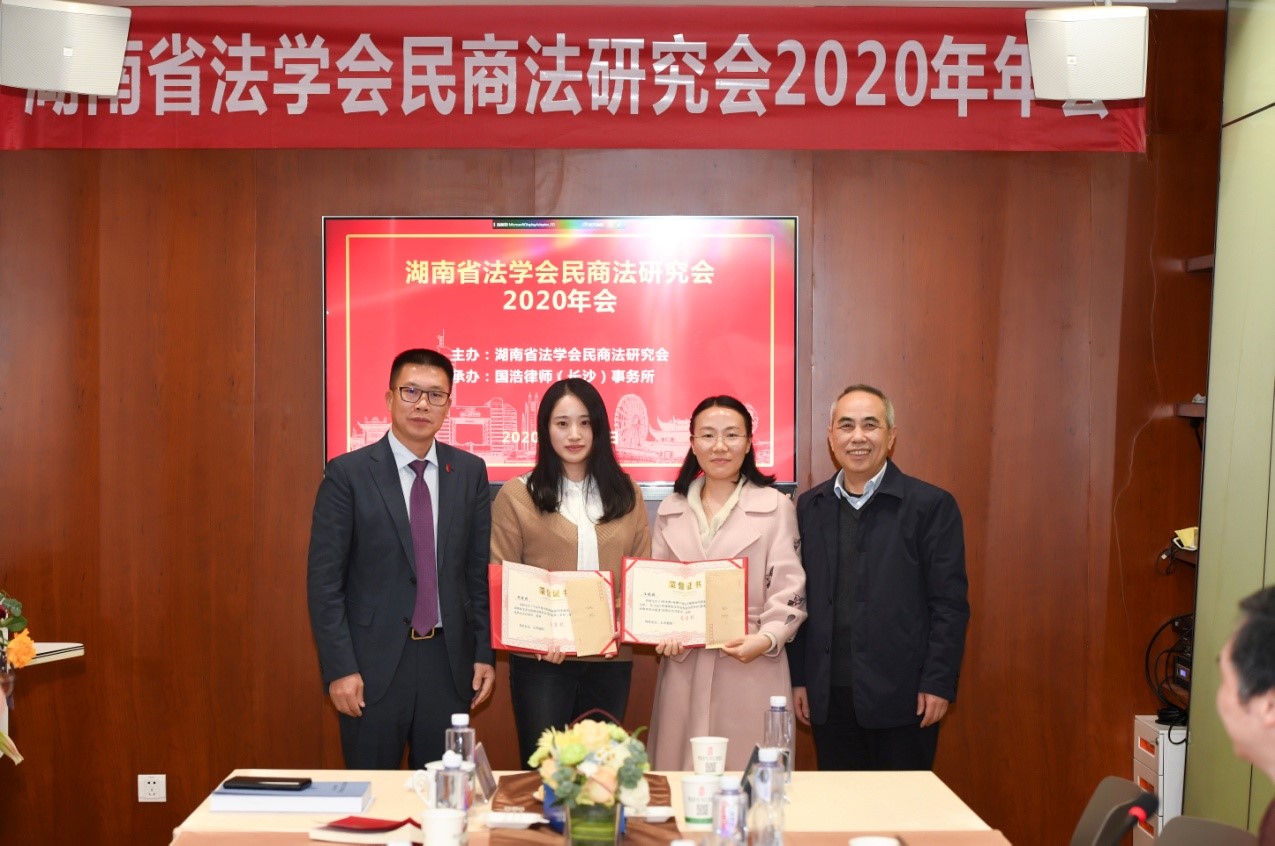 在本次会议的闭幕式中,湖南省法学会民商法研究会副会长、湖南省高级人民法院研究室主任陈坚法官致辞,对年轻一代的学者提出了殷切期许。肖海军教授宣布了“国浩律师(长沙)事务所青年学术基金”优秀论文获奖人名单,以此鼓励年轻学者和硕博研究生。经湖南省民商法研究会学术委员会评审,共评出一等奖论文2篇、二等奖论文6篇、三等奖论文9篇、优秀奖论文20篇。国浩律师(长沙)事务所冠名本届青年优秀论文奖并提供奖金。国浩律师(长沙)事务所罗峥主任并与研究会会长、副会长一起向获奖者颁奖。