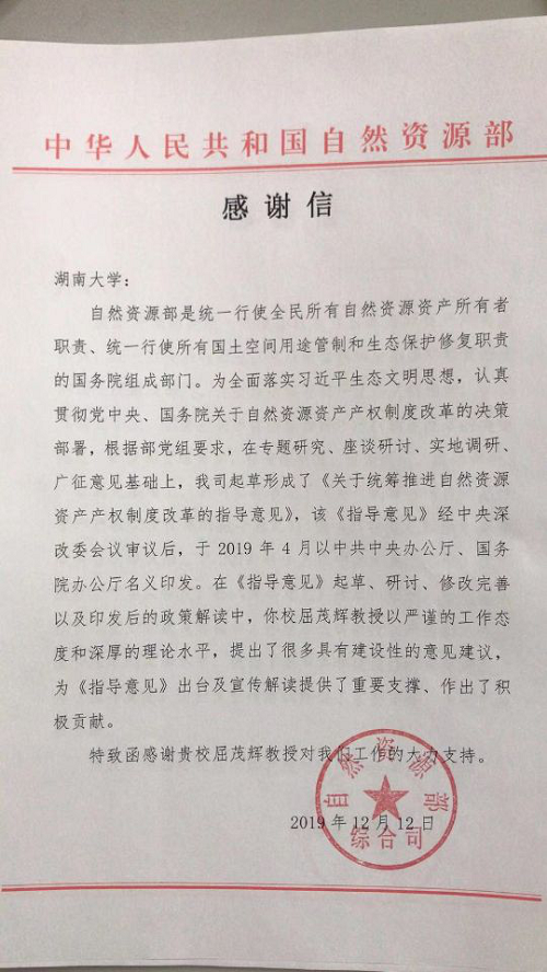 院长、中国自然资源学会资源法学专业委员会副主任委员屈茂辉教授在起草《关于统筹推进自然资源资产产权制度改革的指导意见》等工作中的重要贡献。自然资源部起草形成了《关于统筹推进自然资源资产产权制度改革的指导意见》,该《指导意见》经中央深改委会议审议后,于2019年4月以中共中央办公厅、国务院办公厅名义印发。自然资源部综合司在感谢信中赞扬道:“在《指导意见》起草、研讨、修改完善以及印发后的政策解读中,你校屈茂辉教授以严谨的工作态度和深厚的理论水平,提出了很多具有建设性的意见建议,为《指导意见》出台及宣传解读提供了重要支撑、作出了积极贡献。特致函感谢贵校屈茂辉教授对我们工作的大力支持。