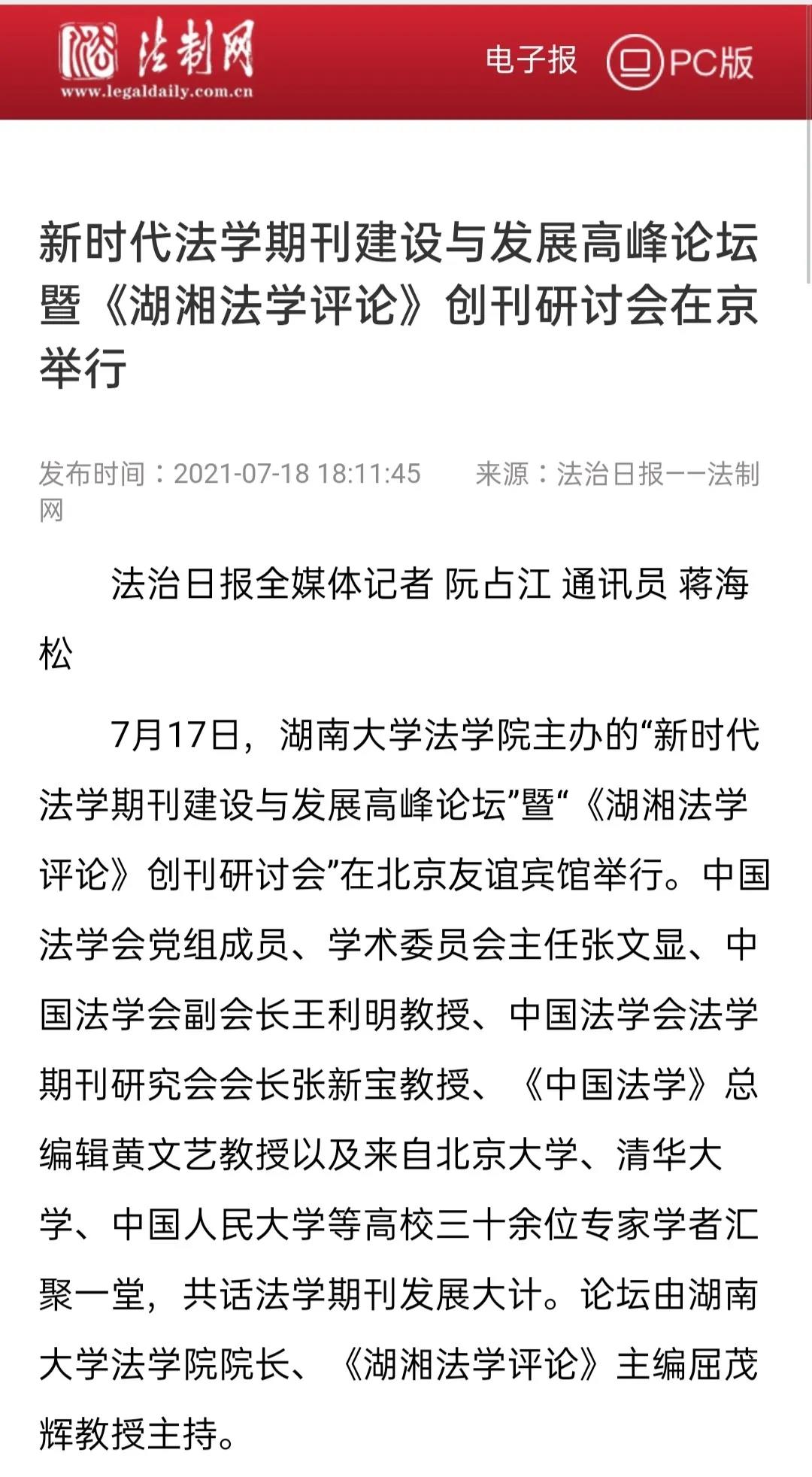 进行建设。2021年9月将首次出刊。《湖湘法学评论》将坚持正确的舆论导向和办刊方向,刊载法治建设理论成果和实践经验,突出实证研究特色,服务法学理论创新和法治中国建设。在《湖湘法学评论》创刊之际,举办研讨会,既为新刊的发展问计于各位专家教授,集思广益,也是为法学期刊界凝聚共识,推动创新发展。