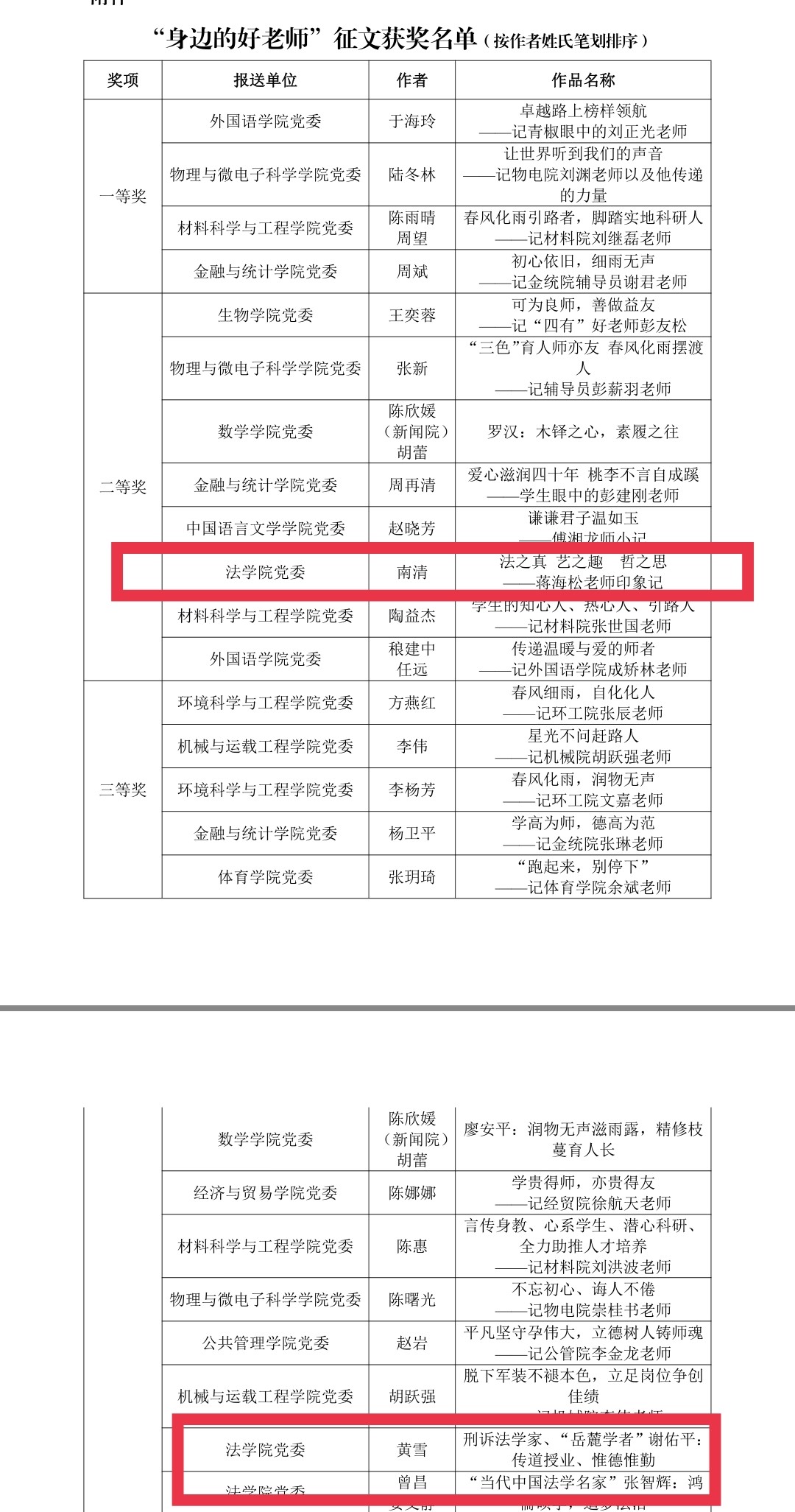 报送了近十篇稿件,其中《法之真艺之趣哲之思——蒋海松老师印象记》(作者南清)获得二等奖,《刑诉法学家、“岳麓学者”谢佑平:传道授业,惟德惟勤》(作者黄雪)、《“当代中国法学名家”张智辉:鸿儒硕学,追梦法治》(作者曾昌、娄文静)荣获三等奖。91论坛