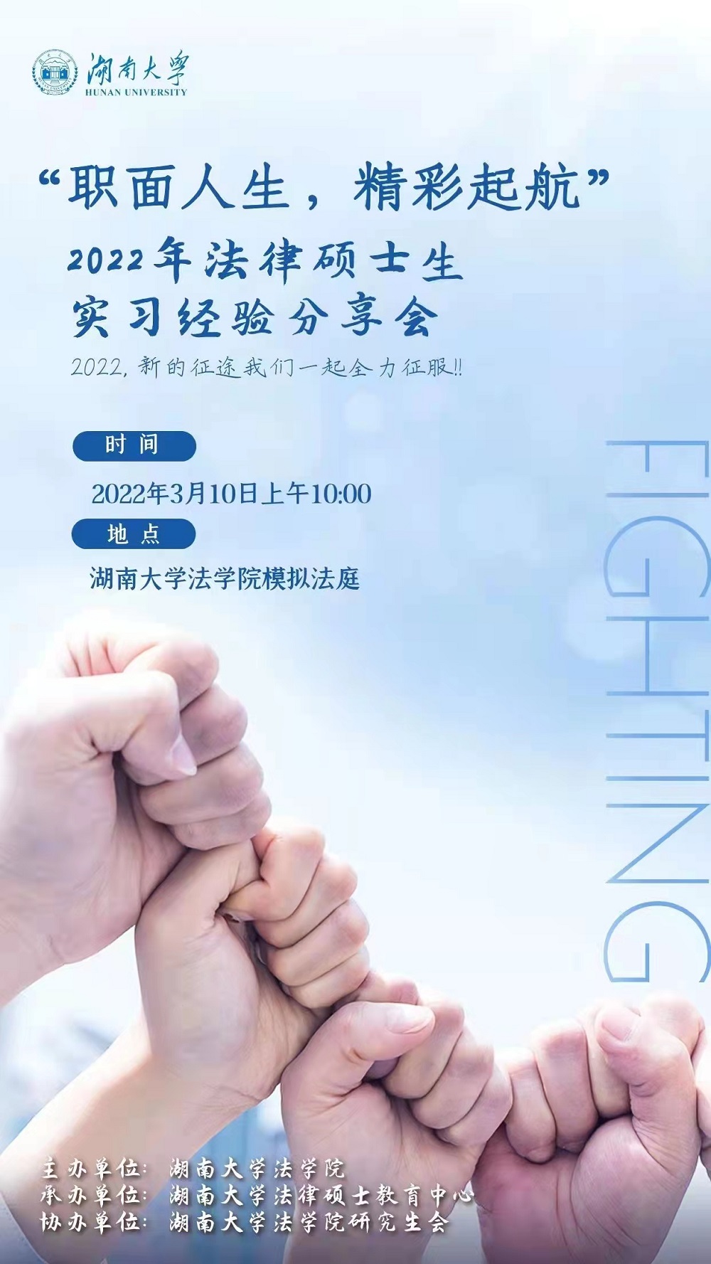 将在模拟法庭举办“职面人生,精彩起航”——2022年法律硕士生实习经验分享会。届时,将邀请参与国家法官学院、行政机关、律所、公司法务四大板块的优秀实习生作为分享嘉宾与同学们进行经验交流,了解各色法律职场。
