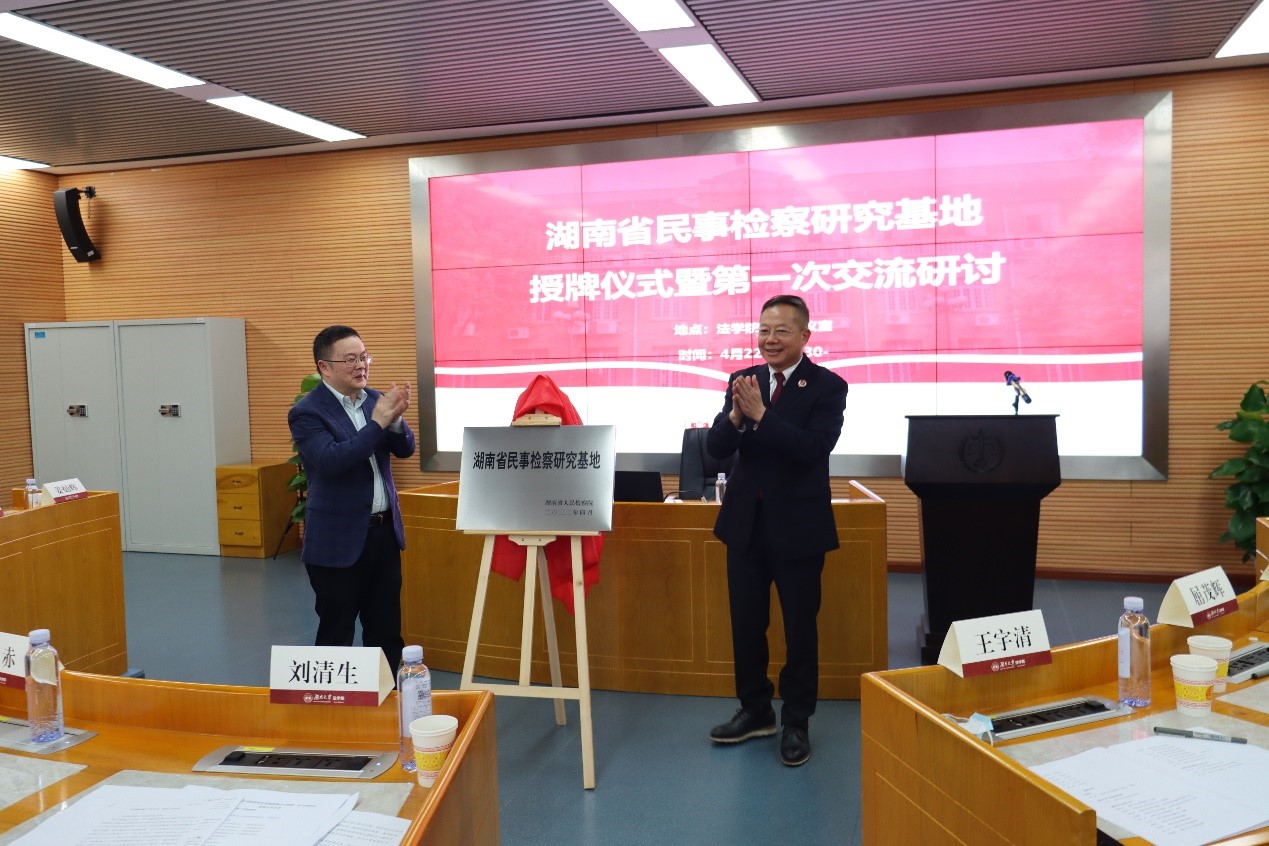 在热烈的掌声中,刘清生副检察长和谢赤副校长共同为“湖南省民事检察研究基地”揭牌。