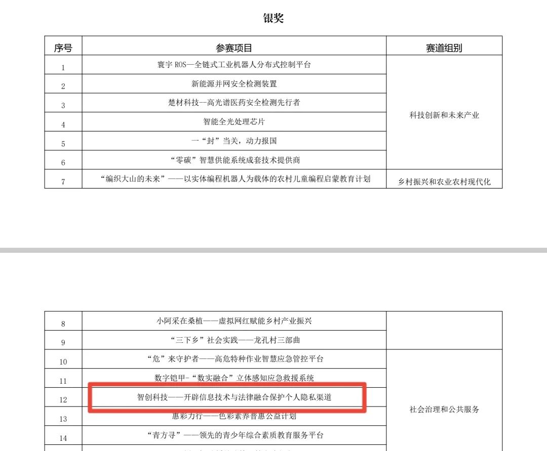 1905班朱雨欣同学主持申报、蒋海松、郑鹏程、张丹老师指导的社会治理和公共服务赛道项目“智创科技——开辟信息技术与法律融合保护个人隐私渠道”获银奖。该奖项的获得展示了91论坛