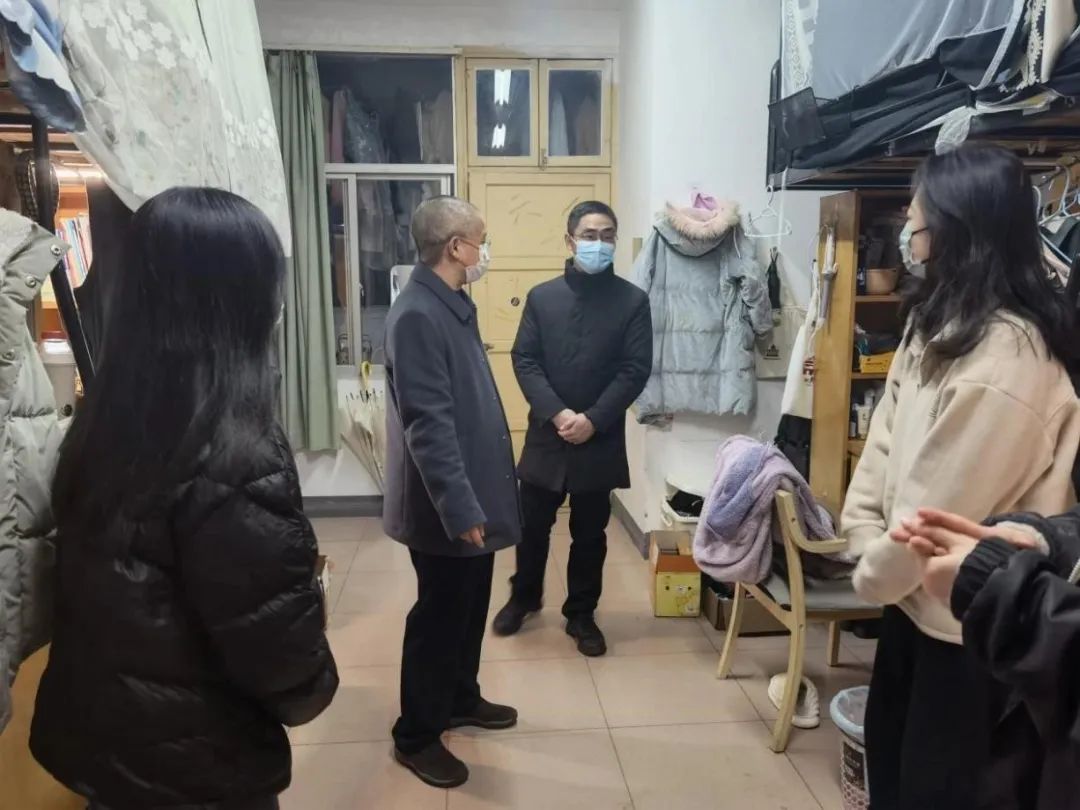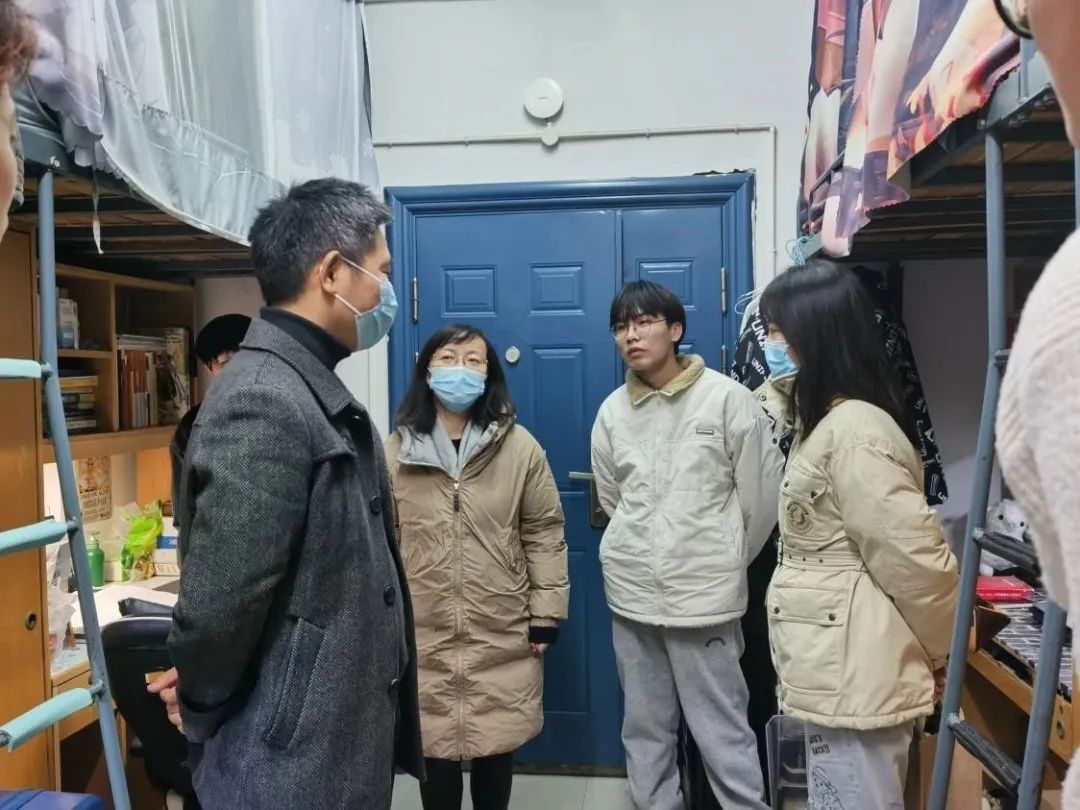 在走访过程中,老师们与同学们亲切交谈,了解了大家在课业学习和日常生活中的各方面情况,同学们亦积极分享了自己在学习生活中的心得体会。对于同学们关注的疫情防控、教学与期末考试安排等问题,老师们结合学校现阶段的安排给出了细致答复,也鼓励各位同学就教学安排、日程规划等问题积极建言献策。老师们也在走访过程中提醒同学们要做好寝室的卫生工作,叮嘱大家在冬日里注意防寒保暖。