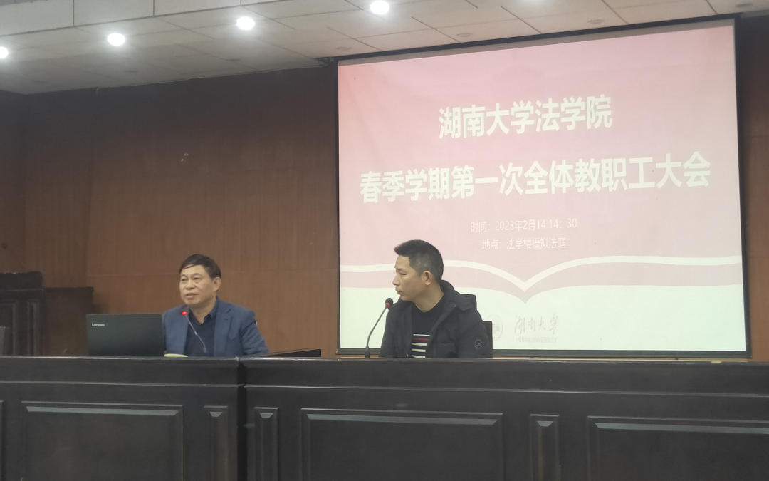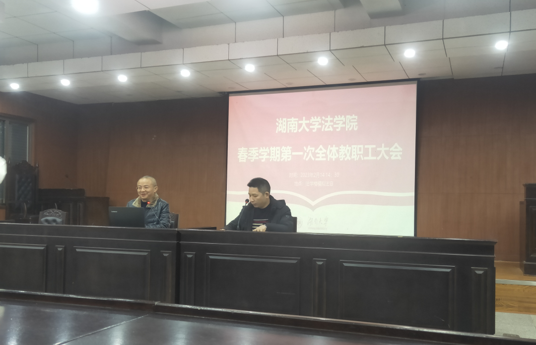 2023年2月14日,新学期第一次教职工大会在模拟法庭召开。黎四奇院长、易骆之书记及各位院领导向全院老师致以新春祝福,并对新学期各方面工作做了部署。