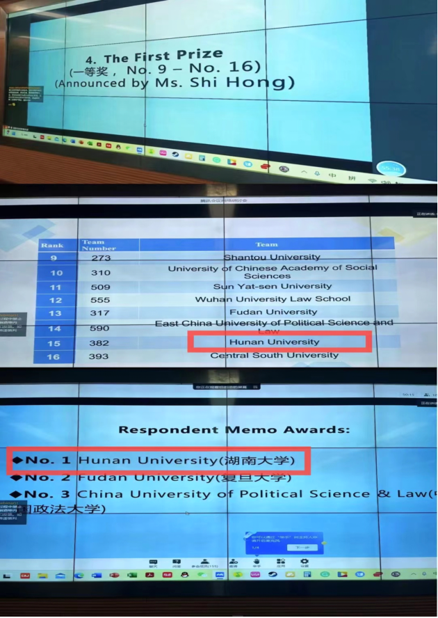 比赛中,面对实力强劲的参赛队伍,湖大队员们毫不示弱、发挥出色,力克强敌,以小组第一的佳绩顺利出线,晋级决赛。在随后的复赛中,我校代表队在各大传统强队和“魔术圈”律所合伙人组成的法官阵容面前亦敢拼敢言,得到了高度肯定。最终,湖大赛队获得“团体一等奖”和“辩方最佳书状第一名”的佳绩,实现了我校在主流法学学科竞赛领域的历史性突破,展现出了湖大学生“敢为人先”的风采。在比赛中,与北京大学、中国政法大学、中国人民大学、中国社会科学院大学、武汉大学、复旦大学、上海交通大学、对外经济贸易大学等全国顶尖院校共同晋级16强,有效促进校际交流。