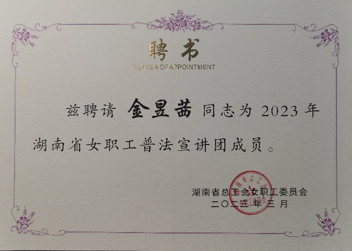 金昱茜老师入选2023年度湖南省女职工普法宣讲团。