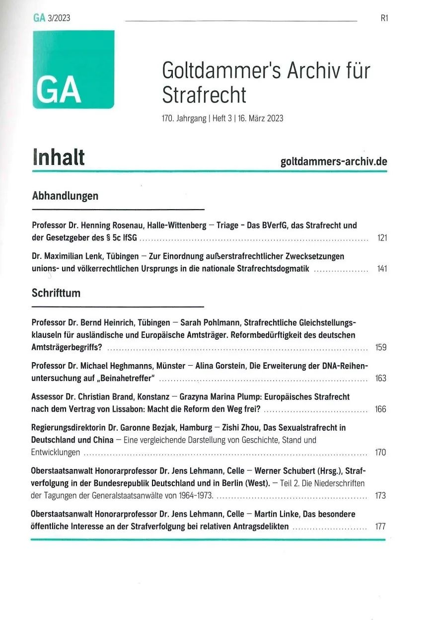 周子实老师于2020年出版的德文专著《德国与中国的性犯罪刑法——历史、现状和发展的比较性阐释》(Das Sexualstrafrecht in Deutschland und China — Eine vergleichende Darstellung von Geschichte, Stand und Entwicklungen)被德国学者Garonne Bezjak博士写成书评,发表于最新一期(2023年第3期)的德国刑事法顶级期刊《戈尔特达默刑法档案》(Goltdammer's Archiv für Strafrecht)。