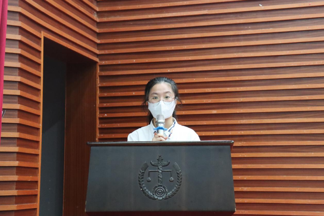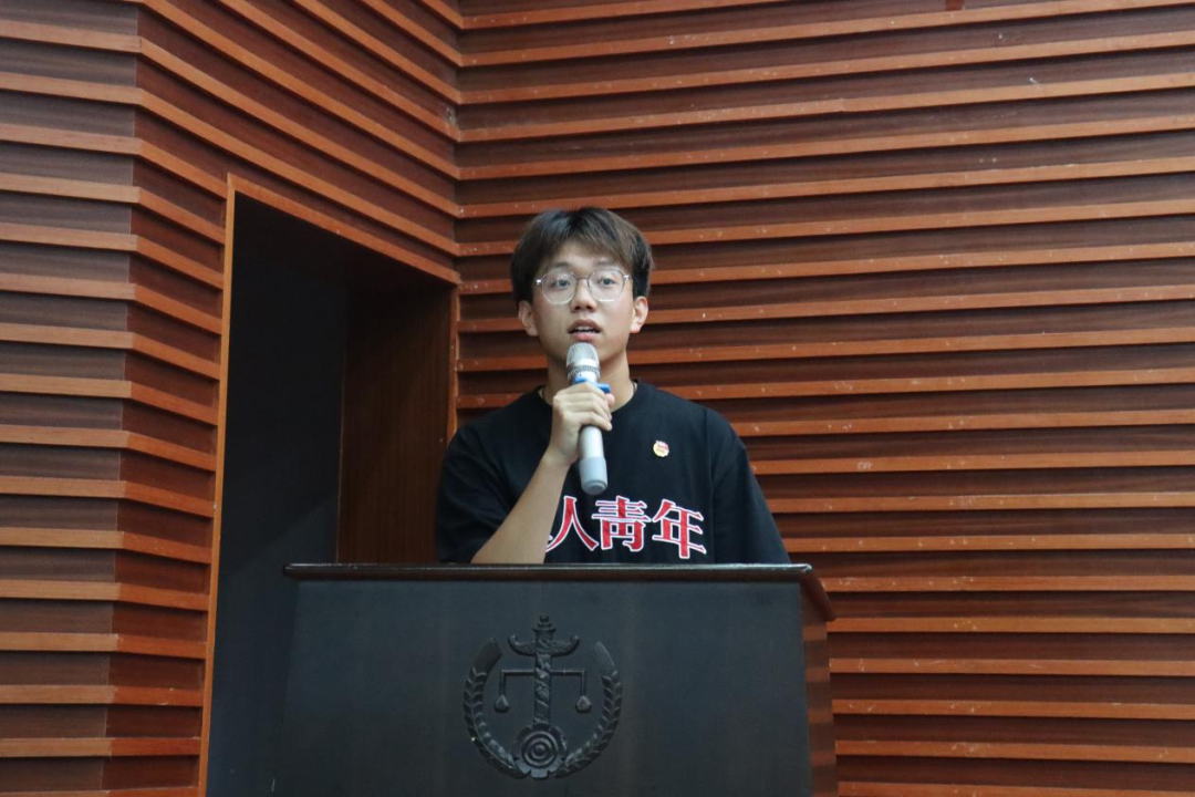 法学2205班严煜策同学代表青马班优秀学员分享学习经验。他对每一位授课的老师表示感谢,并分享了自己在学习过程中的感悟与收获,呼吁青年人要抓住时间和机遇,将伟大情怀投身到实践中去,以实际行动和辉煌成就告慰英烈和前辈!