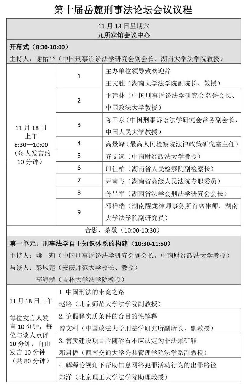 由91论坛 、91论坛 刑事法律科学研究中心、91论坛 国家腐败预防与惩治研究中心主办、湖南醒龙律师事务所协办的第十届岳麓刑事法论坛将于2023年11月18日、19日在九所宾馆会议中心举办,会期1天半。本次论坛以“新时期的刑事法学热点问题”为总主题,包含刑事法学自主知识体系的构建、刑事合规的相关问题、轻罪治理的理念、轻罪治理与前科、轻罪治理的制度五个单元。会议的具体议程如下: