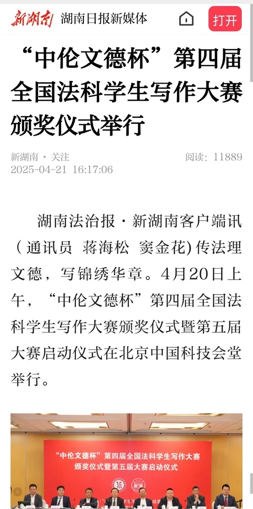 湖南法治报·新湖南客户端讯(通讯员 蒋海松 窦金花)传法理文德,写锦绣华章。4月20日上午,“中伦文德杯”第四届全国法科学生写作大赛颁奖仪式暨第五届大赛启动仪式在北京中国科技会堂举行。