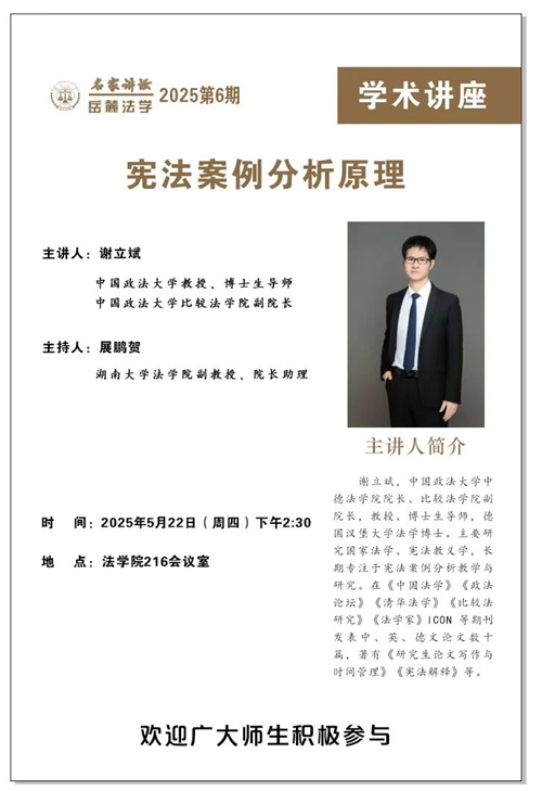 谢立斌教授是德国汉堡大学法学博士,现任中国政法大学教授、博士生导师。作为我国宪法学领域的知名学者,他长期深耕国家法学、宪法教义学领域,尤其在宪法案例分析的教学与研究方面成果丰硕。在学术研究上,谢立斌教授学术视野开阔,精通中、英、德三语,在《中国法学》《政法论坛》《清华法学》《比较法研究》《法学家》等国内权威期刊以及ICON等国际期刊发表论文数十篇,著有《研究生论文写作与时间管理》《宪法解释》等多部学术著作。