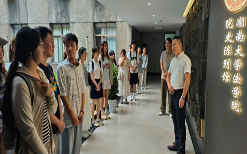 院史陈列馆位于法学楼四楼,占地面积约85平米。建筑布局上,馆内空间高度从3.5米到9米不等,依曲水流觞之势而建;为节约空间,参观动线上,以“几”字呈现;院史陈列馆上方悬挂着有宪法全文的流线型灯带,寓意宪法至高无上的地位。