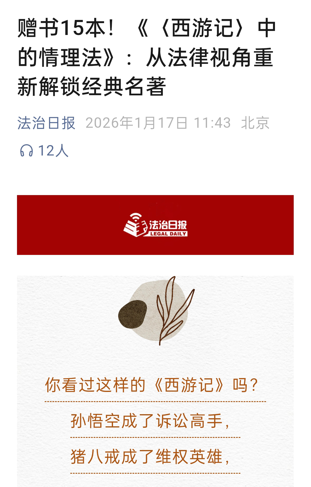 1.《法治日报》2026年1月25日 报道 《用法理之眼观照神话文学——〈西游记中的情理法〉新书发布会侧记》