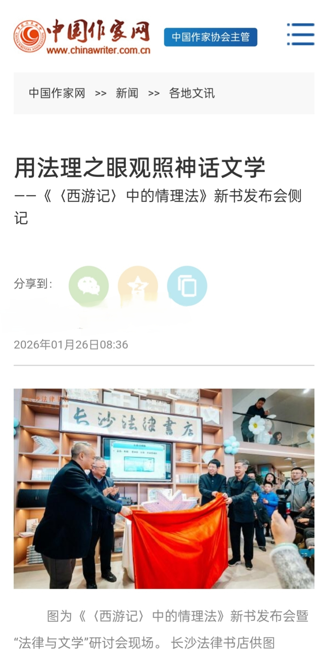 7.红网报道《法律与经典的千年对话:《西游记中的情理法》新书发布会在长沙举行》2026-01-18
