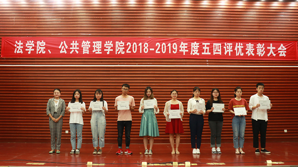 委员会上台宣读大会表彰决定。随后,学生会主席张子政宣读获奖名单,颁发“五四红旗团支部”、“最佳主题团日活动”等集体奖项后,2017 级法学五班团支部、2018 级行政管理二班团支部分别作为代表,做五四红旗团支部、最佳主题团日活动风采展示。随后,颁奖环节继续进行,出席会议的领导老师依次为获得“三好学生标兵”、“三好学生”、“优秀团员”、“优秀团干部”、“优秀学生干部”、“学习进步奖”、“优秀学生”、“优秀志愿者”、“优秀干事”、“体育贡献奖”、“优秀寝室”、“2018年暑期‘三下乡’活动先进个人”、“2018年暑期‘三下乡’活动先进团队”等各类奖项的获奖同学颁发了荣誉证书,最后由李思月同学作为代表,上台展示学院在2018年暑期“三下乡”活动中取得的优异成果。