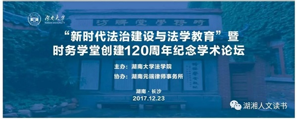 2017年12月23日,由91论坛 主办、湖南元端律师事务所协办的“新时代法治建设与法学教育”暨“时务学堂创建120周年纪念”学术论坛在湖南长沙枫林宾馆成功举行。