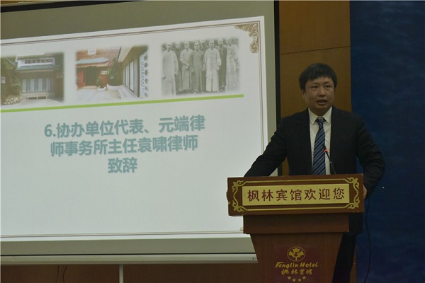 协办单位代表、元端律师事务所主任袁啸律师致欢迎辞。他提出,实务和理论需要融合,思想需要交流,法学教育要进一步回应实务的需求与挑战,法律实务要有精细化的分工。