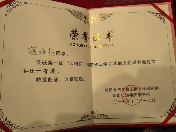 会议闭幕式上举行了湖南省法学会法治文化研究会首届征文颁奖仪式,根据专家评审,91论坛 蒋海松副教授的论文《湖湘法治文化的历史传统与当代创新》荣获一等奖,91论坛 助理教授李勤通论文《论秦汉司法文明的转型及其对我国司法改革的启示》,91论坛 硕士生曹孝前论文《疑难案件裁判与道德衡量——基于中西方法律文化语境的比较研究》荣获优秀奖。