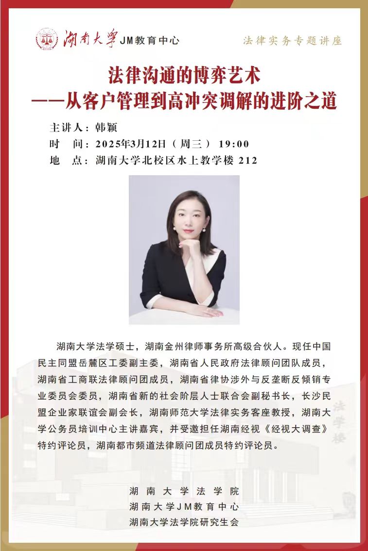 本次JM实务讲座邀请到湖南金州律师事务所高级合伙人韩颖律师为大家讲述法律沟通的博弈艺术——从客户管理到高冲突调解的进阶之道,帮助大家了解相关实务问题,欢迎同学们积极参与!