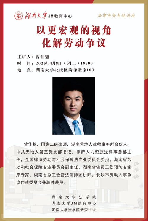 本次JM实务讲座邀请到湖南天地人律师事务所合伙人曾佳魁律师为大家讲述以更宏观的视角化解劳动争议,帮助大家了解相关实务问题,欢迎同学们积极参与!