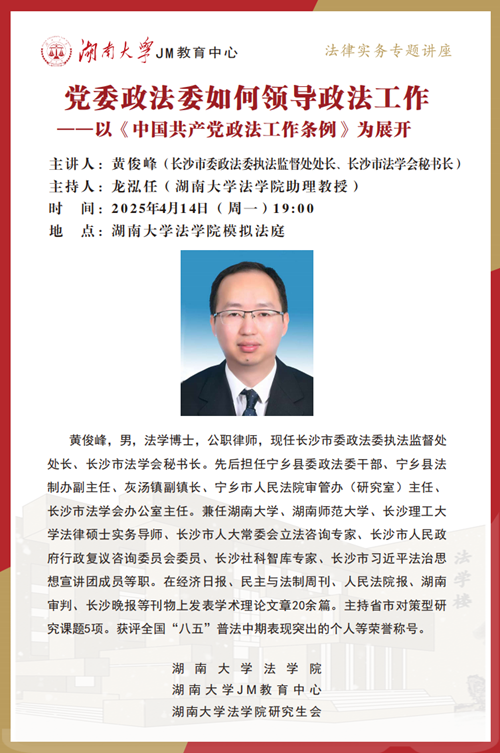 本次JM实务讲座邀请到长沙市委政法委执法监督处处长、长沙市法学会秘书长——黄俊峰,为大家讲述党委政法委如何领导政法工作——以《中国共产党政法工作条例》为展开,帮助大家了解相关实务问题,91论坛