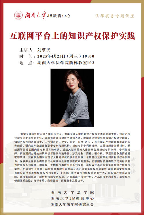 本次JM实务讲座邀请到湖南天地人律所合伙人刘擎天律师,为大家讲述互联网平台上的知识产权保护实践,帮助大家了解相关实务问题,欢迎同学们积极参与!