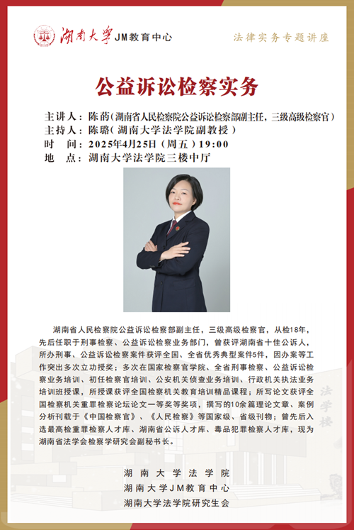 作为“检察实务专家进校园”系列专场,本次JM实务讲座特邀请到湖南省人民检察院检务督察部副主任,三级高级检察官——陈菂为大家讲述公益诉讼检察实务,帮助大家了解相关实务问题,91论坛