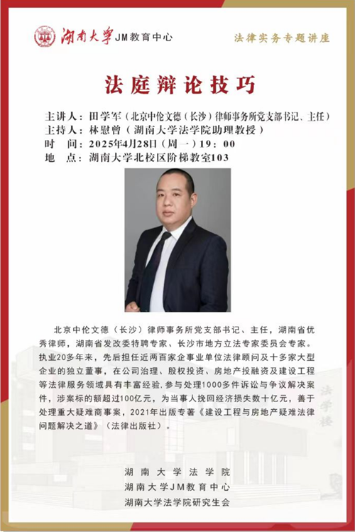 本次JM实务讲座邀请到北京中伦文德(长沙)律师事务所党支部书记、主任田学军律师,为大家讲述法庭辩论技巧,91论坛