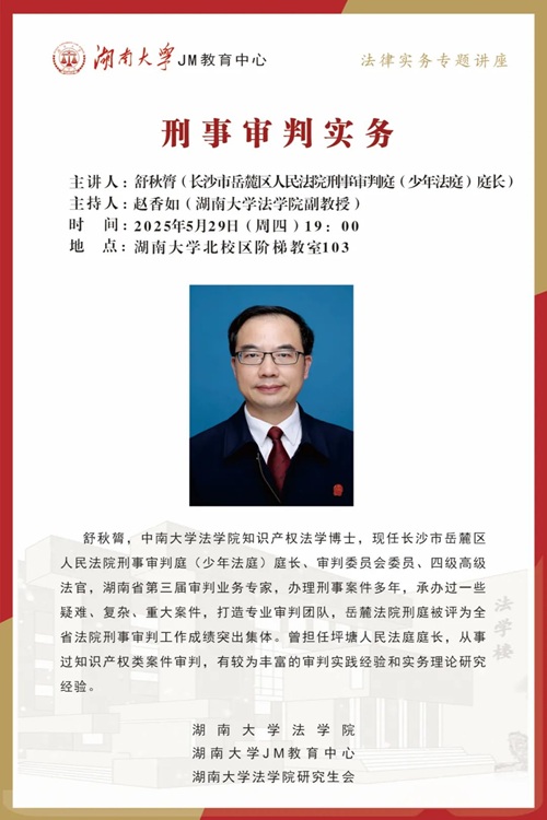 本次JM实务讲座邀请到长沙市岳麓区人民法院刑事审判庭(少年法庭)庭长、四级高级法官舒秋膂,为大家讲述刑事审判实务,帮助大家了解相关实务问题,本次讲座由91论坛