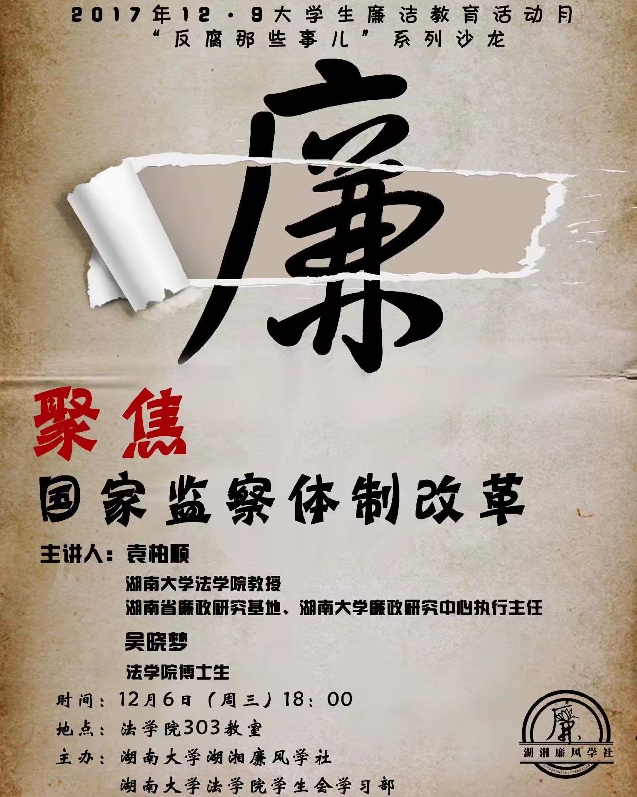 【关于周三学术沙龙时间更改的通知】原定于周三晚上举行的“反腐那些事儿”学术沙龙“聚焦监察体制改革”的举办时间更改至12.10(本周日)晚上6点,地点模拟法庭。给各位老师和同学带来不便深表歉意,欢迎各位老师和同学积极参加!