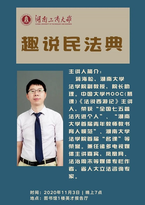 副教授、院长助理蒋海松应湖南工商大学法管学院邀请于该校南校区图书馆1楼英才报告厅作“趣说民法典”主题讲座。讲座由该院蒋科老师主持,法管院长刘期湘、党委书记胡艳香、党委副书记袁露等老师出席,学院法学本科生和部分其他专业的学生400余人聆听。