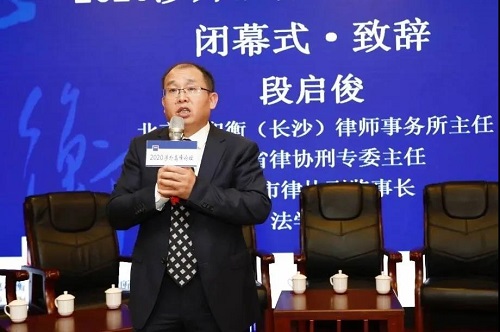 兼职教授、湖南省律师协会刑专委主任、长沙市律师协会副监事长段启俊致闭幕词,对莅临本次论坛的所有嘉宾表示衷心的感谢,对为本次论坛辛勤付出的各位表示衷心的感谢。同时对组织本次论坛过程中可能存在的某些疏漏或差错表示歉意。希望各位嘉宾、各位朋友一如既往地关心、支持我们今后的论坛活动。