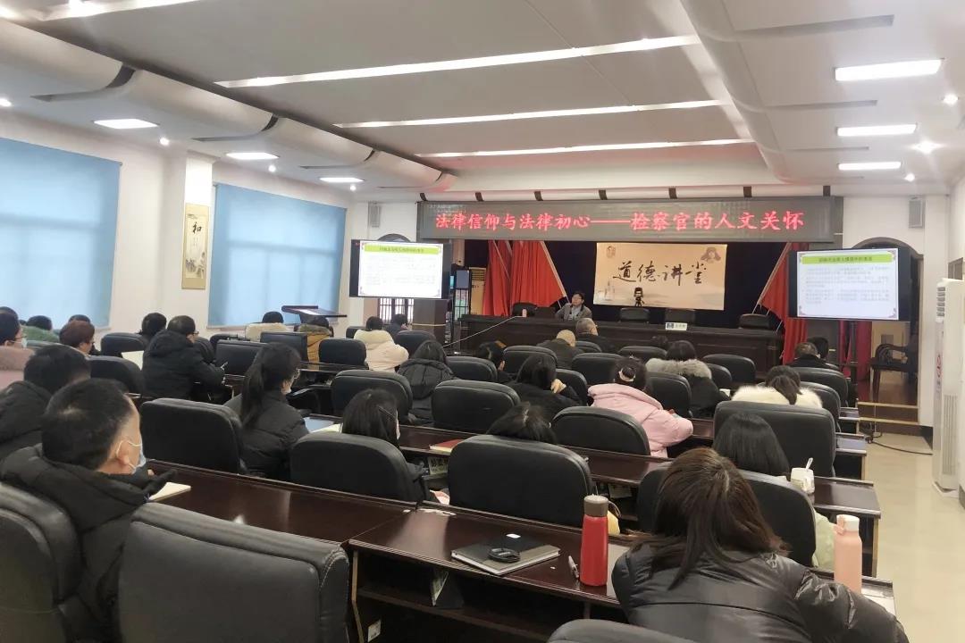 副院长、副教授蒋海松为全院干警带来了一堂《法律信仰与初心——检察官的人文关怀》的专题讲座。 “坚守为民初心,践行检察使命……”蒋海松教授借用最高人民检察院检察长张军所说的话拉开讲座的序幕,时而氛围严肃、时而笑声满堂,从东方到西方、风云历史的革命先辈、热门案例孙小果案、检察剧《人民的名义》、现实版《我不是药神》、检察公益诉讼等一些现实案例和当下热议话题,以案释法,全面又形象地阐释了作为一名检察官应该培养的正义、崇法、清廉、悲悯、信仰的人文精神以及如何做好一名公平正义的守护者!