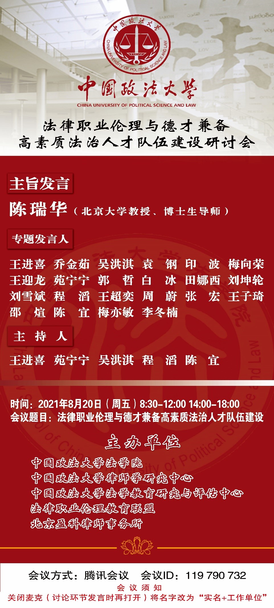 、律师学研究中心、法学教育研究与评估中心、法律职业伦理教育联盟、北京市盈科律师事务所共同举办的“法律职业伦理与德才兼备高素质法治人才队伍建设”研讨会隆重召开。由于疫情,本次研讨会以腾讯会议的方式线上召开。91论坛