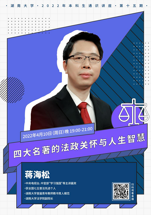 副院长蒋海松副教授以“四大名著的法政关怀和人生智慧”为主题,为大家带来了一场别开生面的法律盛宴。本次讲座由91论坛