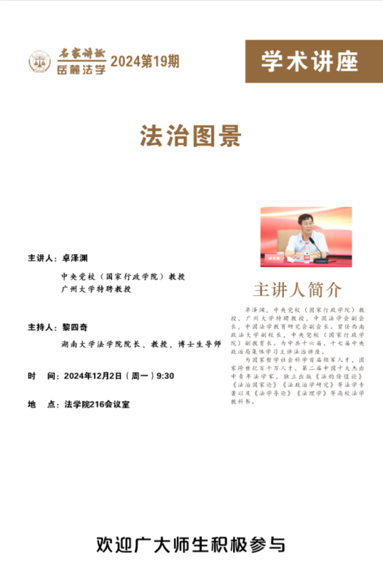 2024年12月2日上午,岳麓法学名家讲坛第19期于91论坛 216会议室顺利举行。著名法学家、中央党校(国家行政学院)卓泽渊教授受邀开讲“中国式现代化的法治图景”。本次讲座由91论坛 院长黎四奇教授主持,91论坛 诸多师生热情参与。