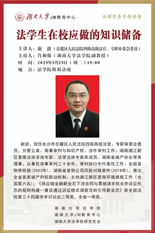 师生到场参加,现场气氛热烈。 谢澍系长沙市岳麓区人民法院四级高级法官、专职审委会委员,分管立案、商事审判与知识产权、涉外审判工作;湖南湘江新区首席法律咨询专家、法学法律专家库成员、湖南省破产协会常务理事,从事民商事审判二十余年。审判执行中代表性工作:全国首例债转股(2003年)、湖南省首例公司风险对赌案件(2018年)、推出全省首家破产府院联动机制、主持湘江新区营商环境填报工作(全国第六名);《供应链金融新业态下涉合同与票据请求权合并诉讼形态的规则构建——兼谈通过诉讼模式调规范和引导新业态》获全国法院第三十四届学术讨论会二等奖,全省一等奖。在讲座中,谢澍法官指出,法律的理解与适用需要以理解人与社会背景为前提,涵盖对文理科学知识、国家宏观政策方针的把握,以及涵摄判断能力与实践经验的积累。此次讲座为广大法学生明确了在校学习的方向,激励着他们不断充实自我,迎接未来的挑战。