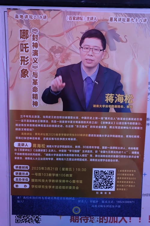 副院长蒋海松教授应邀作客高地讲坛·蕙风讲坛暨2025春季学期研究生800级讲座。蒋海松结合当下最火的电影《哪吒2:魔童闹海》,带领观众穿透神话帷幕,透视反叛与抗争的文明基因。