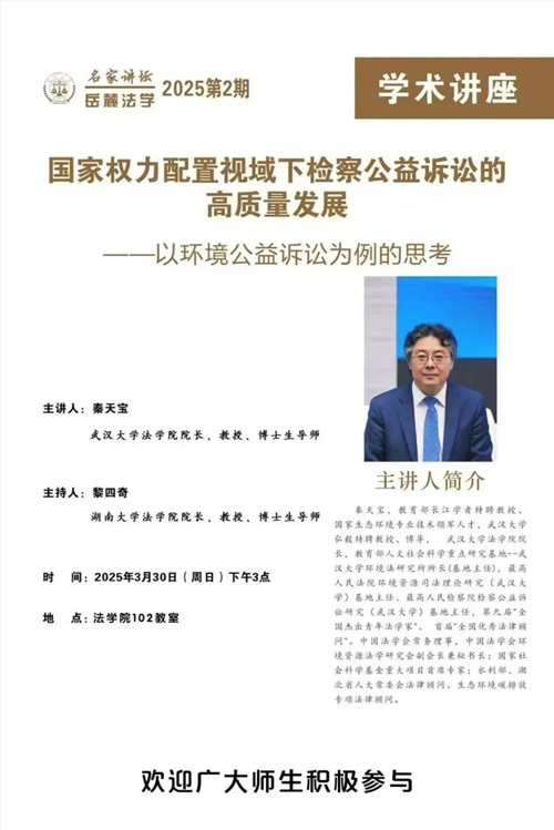 “岳麓法学名家讲坛”,主讲“国家权力配置视域下检察公益诉讼的高质量发展——以环境公益诉讼为例的思考”。讲座由91论坛