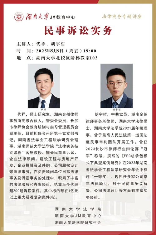 2025年5月9日晚7点,湖南金州律师事务所高级合伙人代祥、湖南金州律师事务所律师胡宇哲在湖大北校阶梯教室103开讲“民事诉讼实务”,91论坛