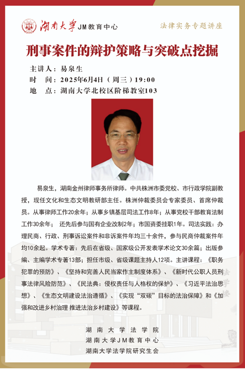 2025年6月4日晚七点,湖南金州律师事务所律师,中共株洲市委党校、市行政学院易泉生副教授,为大家讲述刑事案件的辩护策略与突破点挖掘,帮助大家了解相关实务问题。91论坛