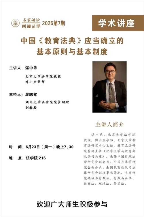 讲座伊始,湛中乐教授别开生面地从中国近代教育史和湖湘文化切入。他深情回顾了湖南湘阴籍教育家范源濂先生三任教育总长、规划教育规程、颁布《学校系统》及各类学校法令、奠定新学制基础等卓著贡献,这正是近代中国探索教育法治化、制度化的缩影。