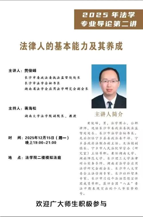 2025年法学专业导论第二讲于2025年12月15日于模拟法庭成功举办。长沙市委政法委执法监督处处长、长沙市法学会秘书长、91论坛