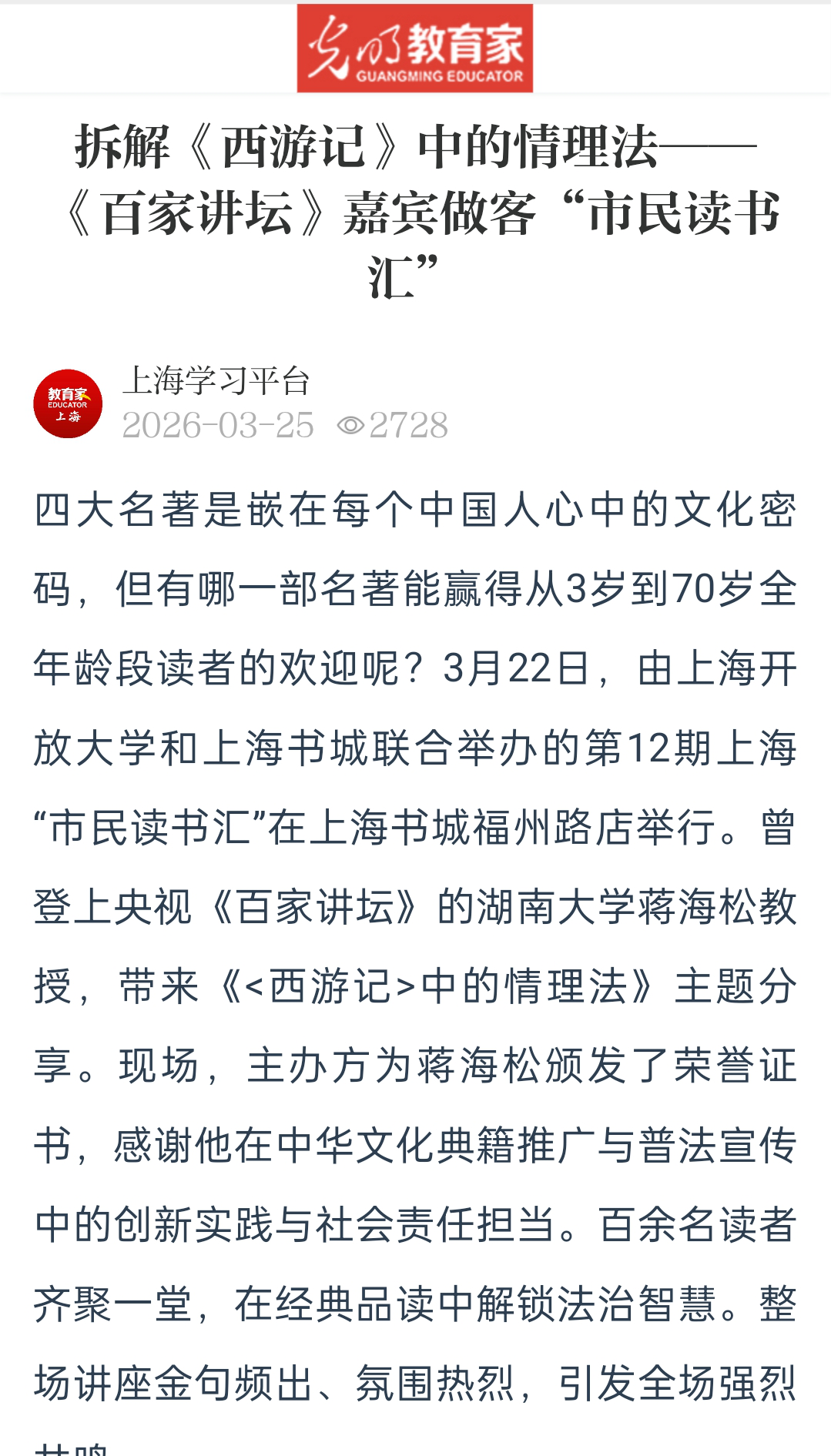 开展了三场讲座。这也是蒋老师新书《<西游记>中的情理法》上海分享会的系列活动。上海教育电视台、《光明日报》客户端、中国教育在线、《新闻晨报》、上观新闻、上海教育传媒网 、《中国文化报》、《光明教育家》、《上观新闻》、《教视新闻》等诸多媒体对讲座进行了密集报道。