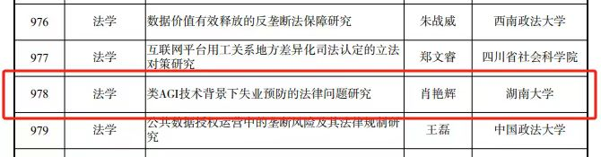 肖艳辉老师申报的“类AGI技术背景下失业预防的法律问题研究”获准2024年度国家社科基金一般项目立项。这是肖艳辉老师在2022年刚完成了国家社会基金一般项目《权利二分法的局限与社会救助权及其保障的再解释》的基础上又添国家一般项目的立项成果