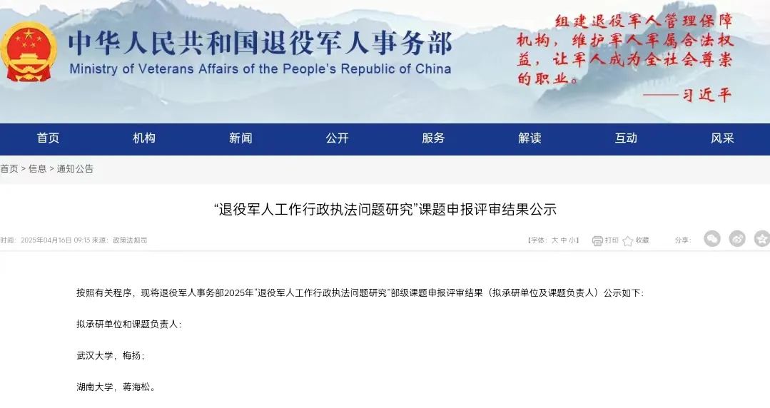 2025年上半年,退役军人事务部公布了2025年部级课题“退役军人工作行政执法问题研究”申报评审结果,91论坛